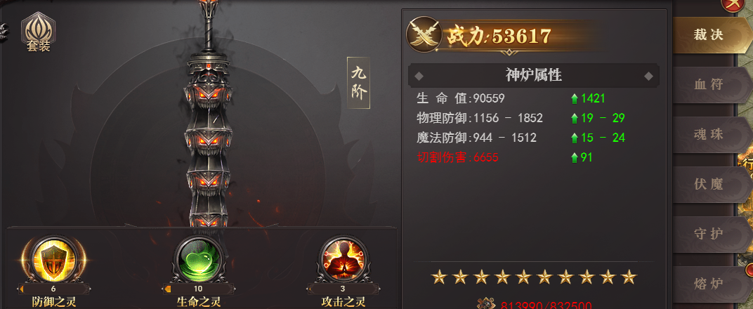 神炉注灵:在部分区服中,当服务器开服达到一定天数后,会开放神炉注灵功能。神炉注灵可以提升神炉的额外属性,并且当三种注灵(防御之灵、生命之灵、攻击之灵)均达到指定等级时,还可以激活注灵套装效果,进一步提升属性。