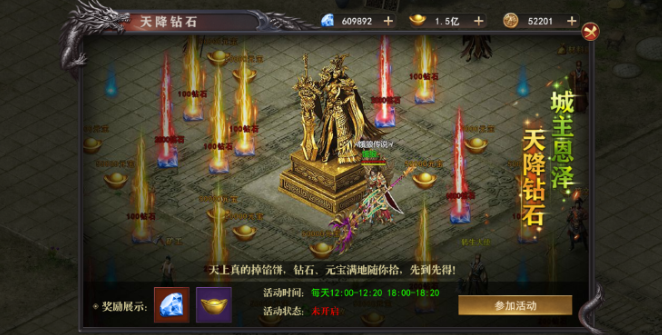 1.活动开启后,将在王城安全区附近的随机生成多个钻石、元宝的采集物。
