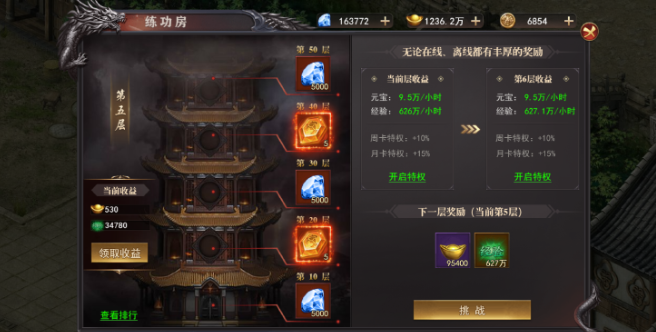 玩法简介:练功房为个人闯关玩法,游戏中经验大量产出的途径。