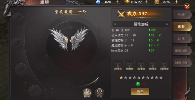 翅膀升星可改变翅膀的外观和加强角色属性收益